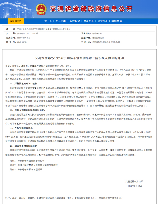 據北京四通搬家公司了解,8月24日,交通運輸部發布《關于加強車輛運輸車第二階段執法檢查》的通知。通知要求,嚴控不合規車輛運輸車違規運輸,督促不合規車輛運輸車按階段退出市場,全面完成第二階段“單排車”變“標準車”的治理目標。同時發布了《車輛運輸車違規運營告知書》、《高速公路收費站入口車輛運輸車核查流程》及《車輛運輸車標準車型圖示》三份規范性文件。