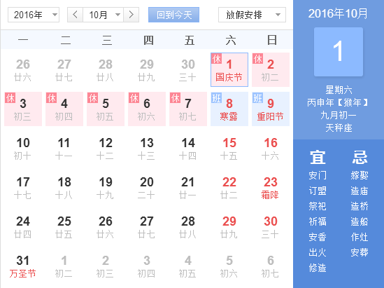 2016年國慶放假安排:
